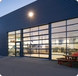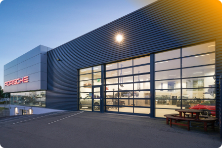 Стеклянные секционные ворота выглядят современно и оригинально, обеспечивают приток естественного света в помещение. Отличный вариант для автомоек, СТО, автоцентров, фасадов зданий в современном стиле. Остекление может быть сплошным и частичным, также доступно комбинированное заполнение (панорамные панели в сочетании с сэндвич-панелями).